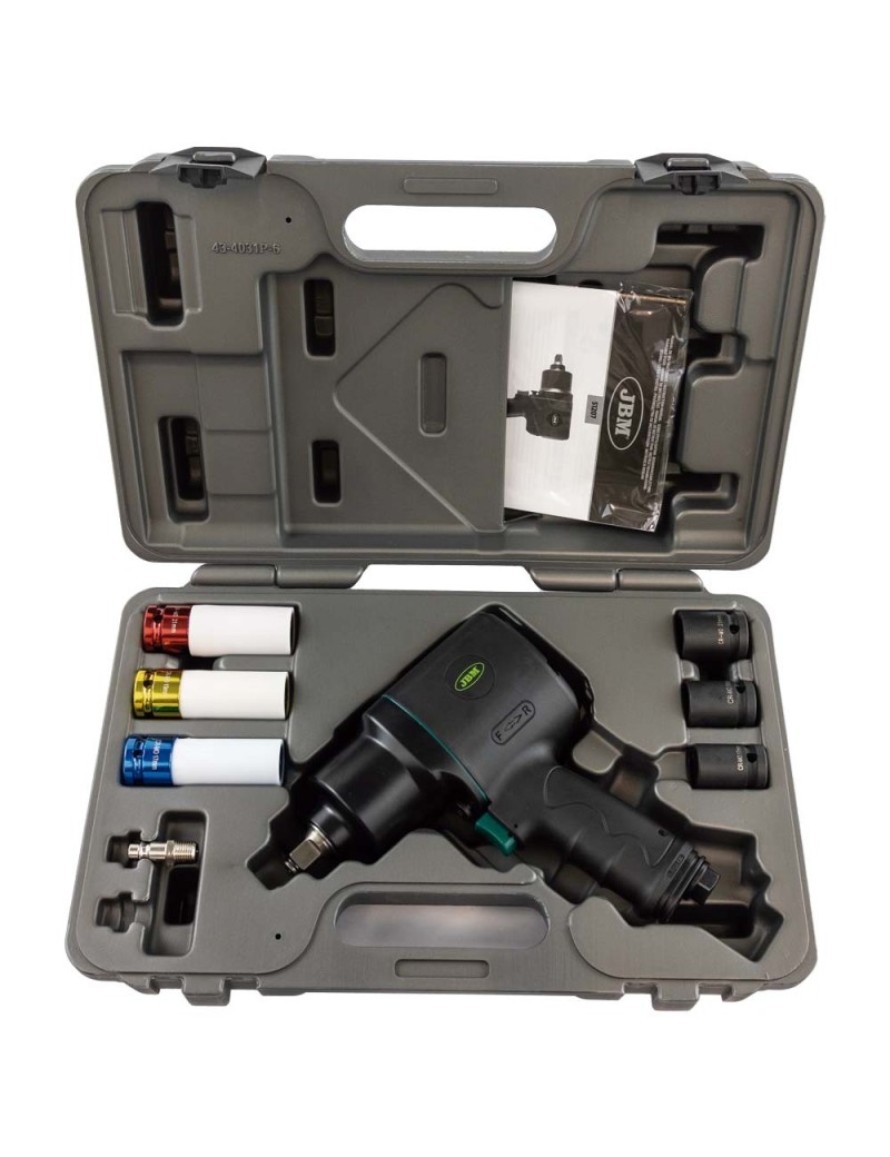 Motor compuesto. Disponible en 1/2" Con Torsion Controlada Doble mecanismo de Martillo Max. Operacion: 7000 RPM Max. Par: 1756Nm Ligero Nivel ruido reducido: 83dB (A) Incluye: Dado de 17mm, 19mm y 21mm Puntas Impacto de 17mm, 19mm y 21mm Conectable a manguera con el adaptador ref. 13931 (no incluido)