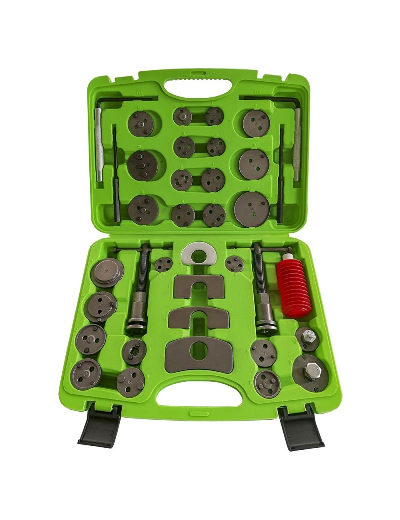 Sistema de uso múltiple con 37 piezas para reposicionar los pistones de freno. Valido para la gran mayoria de vehículos. Contiene: - 2 llaves hex. de 6 y 7mm - 2 tabillas para los sistemas de freno de Mercedes y Opel - 3 cojines de apoyo para usar en zapatos de freno y rebajo en areas con limitacion de espacio - 3 cojines de apoyo para usar en zapatos de freno y trabajo en áreas con el espacio limitado - Fuelle con aceite lubricante - Lista de modelos de vehiculos y usos - 26 adaptadores para vehículos