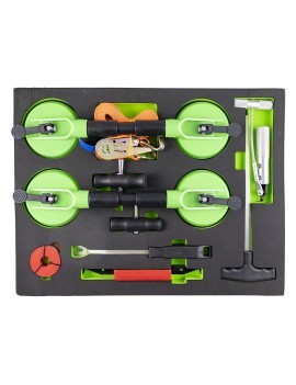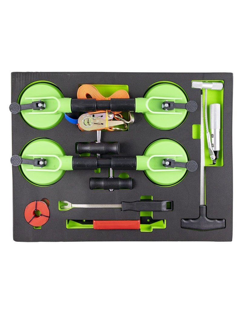 módulo EVA con: 1x Ãtil extractor de molduras 1x Palanca para extraer la goma 1x Gancho extractor 1x 1.8m de alambre de corte 2x Mangos para el alambre de corte 1x Pasa-cables 2x Ventosa extractora 1x Correa con trinquete