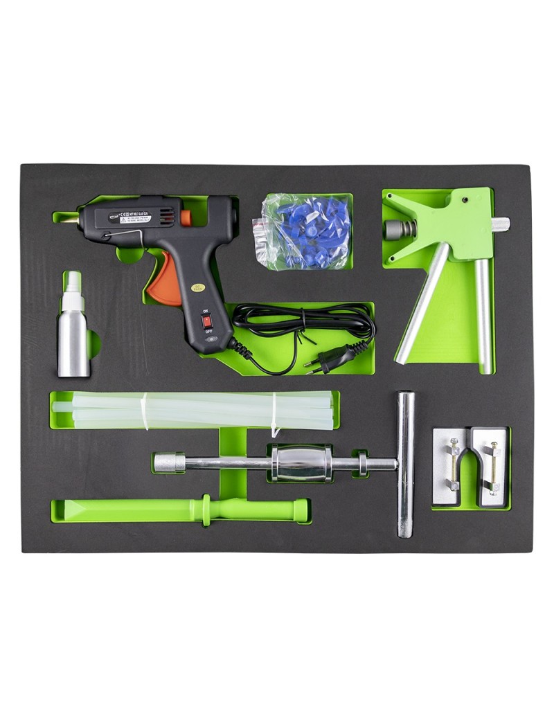 MODULO PARA REPARAR BOLLOS módulo EVA con: 1x Pistola de pegamento (220-240v ~, 50hz, 40w) 1x Martillo deslizante para la extracción de abolladuras profundas 1x Levantador de abolladuras para la extracción de abolladuras ligeras en superficies planas 1x Limpiador de pegamento 1x Rascador para la extracción suave de las lengüetas para pegamento 8x Barras de pegamento negro (11 x 200mm) 19x Lengüetas para pegamento en varios Tamanos y formas