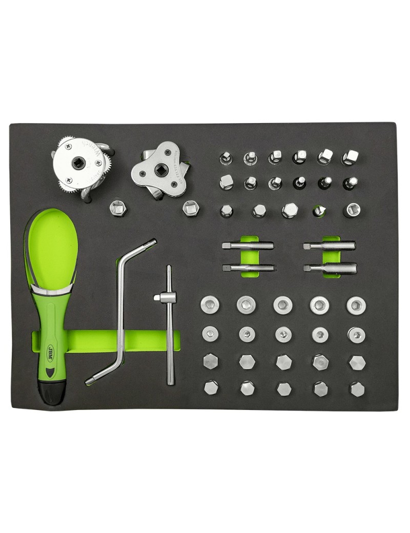 MODULO MANTENIMIENTO ACEITE 1x llave tapon Carter 8 x 10mm 1x extractor de filtro aceite pata plana 57-125mm 1x extractor de filtro aceite redonda 69-135mm 1x extractor de filtros ajustable 65-105mm 110-155mm 9x vasos cuadrados 1x vaso cuadrado hembra 1x vaso triangulo 6x vasos hexagonales 1x mango corredizo + corredera de 165mm 4x brocas 20x tapones 40x arandelas