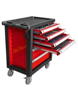 Carro de herramientas de 6 cajones rojo. MEDIDAS EXTERIOR: 900mm alto x 765mm ancho x 460mm largo CAJONES PEQUEÃOS (x4): 70mm alto x 590mm ancho x 415mm largo CAJONES GRANDES (x2): 145mm alto x 590mm ancho x 415mm largo Cajones con apertura de pestillo. Ruedas con frenos. Cierre con llave. Superficie antisdeslizante. Esquinas protegidas con goma muy resistente. CONTENIDO: inluidos módulos EVA con herramientas brillantes AZULES: REF. 53116A: MODULO 108 PIEZAS VASOS HEXAGONALES módulo EVA de 3 alicates - alicate universal 8", alicate punta recta 8", alicate de corte 7,5". módulo de 2 martillos - martillo con cabeza de nylon y martillo de bola. módulo EVA de mordazas - mordaza de presión, mordaza de pinza ajustable. MODULO 7 DESTORNILLADORES TORX EVA. módulo EVA de 7 destornilladores planos de 3.0x75, 3.5x75, 4.0x100, 5x100, 6x150, 8.0x175mm, 6x38mm. MODULO 7 DESTORNILLADORES ESTRELLA EVA. módulo de llaves acodadas EVA de 6x7mm a 18x19mm + 20x22mm. módulo de llaves fijas EVA de 6x7mm a 20x22mm + 24x27mm + 30x32mm. módulo de llaves combinadas EVA de 6 a 22mm.