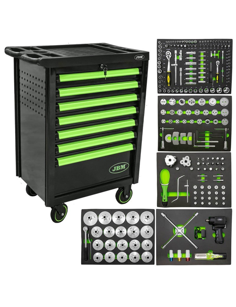 Carro de herramientas verde, especial con todas las herramientas para el mantenimiento del vehículo. Esquinas protegidas con goma muy resistente. Superficie de goma antideslizante. Cierre con llave. Cajones con marcadores de contenido. Incluye bandeja portasprays Cerradura individual. Medidas exterior: ancho 470 / largo 700 / alto 970mm Medidas interior: Cajones pequeños (x5): ancho 400 / largo 535 / alto 60mm cajon mediano (x1): ancho 400 / largo 535 / alto 130mm cajon grande (x1): ancho 400 / largo 535 / alto 200mm Contenido: ref. 14141 - módulo 1: Extractores de filtro de aceite (22PCS) ref. 14142 - módulo 2: reposicionadores de pistón de freno (34PCS) ref. 14143 - módulo 3: reparación de tapones Carter y extractores de filtro de aceite ajustables (86PCS) ref. 14144 - módulo 4: pistola y vasos de impacto (6PCS) ref. 53116 - módulo 5: 108 piezas con vasos hexagonales