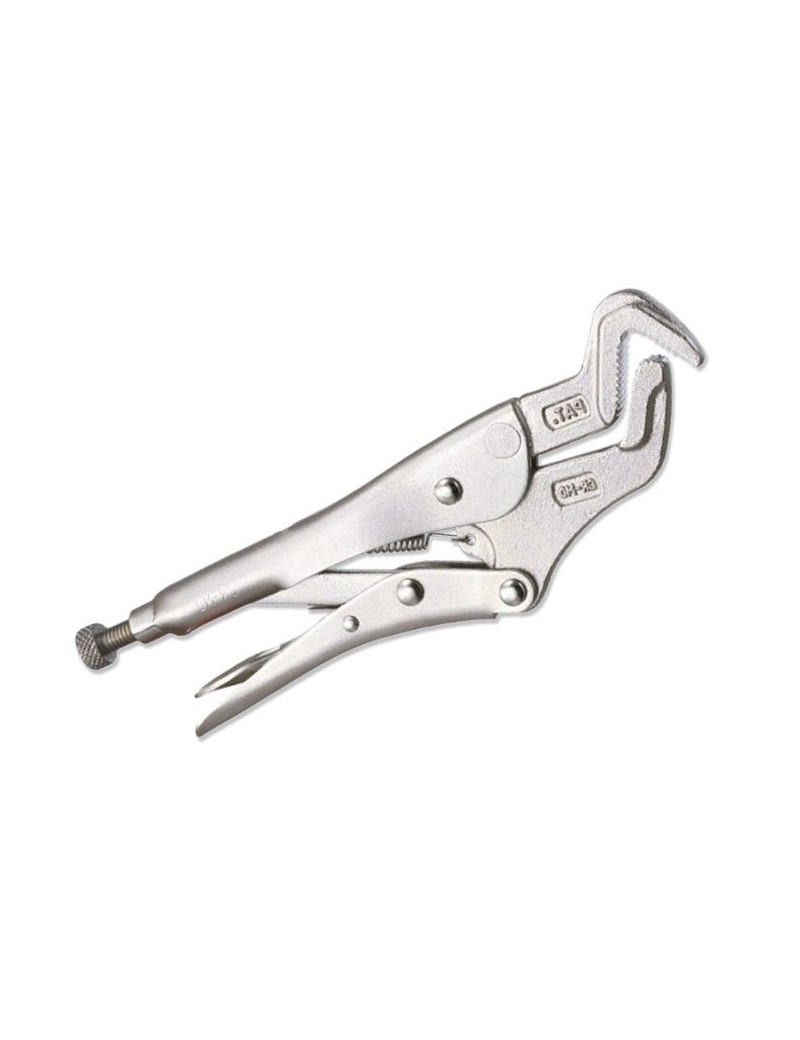 Alicate pico de loro curvado de 215mm. Pico dentado CR-MO Fuerte apriete en superficies circulares. Acabado en ángulo. Agarre a 6 medidas distintas de tuerca / tornillo hexagonal.