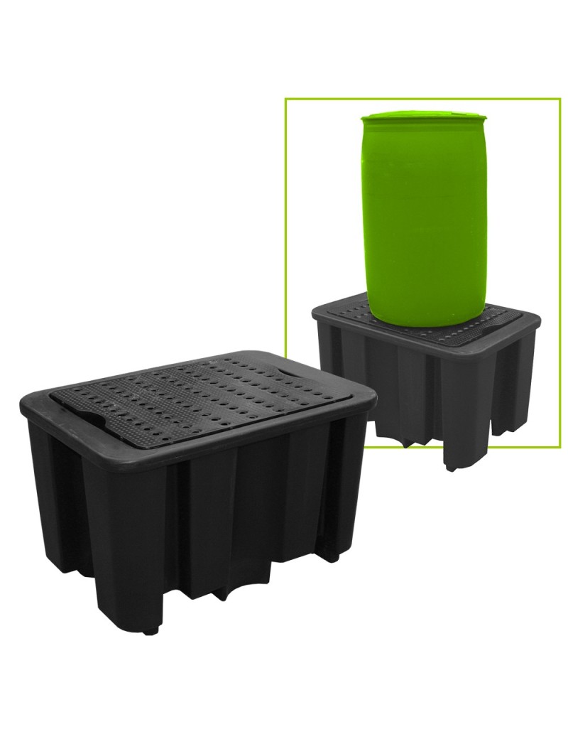 HOMOLOGADO DIBT Soporta 400 kg Bidón: 230L Alto: 600mm / Largo: 1.000mm / Ancho: 680mm - Pallet de derrames para 1 bidón - Cubierta desmontable - Palet fijo para derrames - Quitar los bidones antes de utilizar una carretilla elevadora - Fácil transporte. Para usar con la mayoría de carretillas elevadoras y transpaletas - Fabricado en polietileno (PE) 100% reciclable