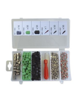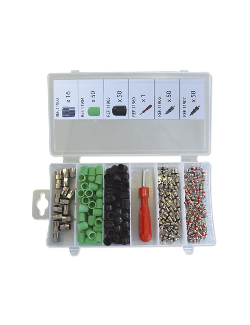 CONTIENE: 11903 - 16 unidades tapón aluminio para válvula neumático 11904 - 50 unidades tapón plástico verde para válvula neumático 11905 - 50 unidades tapón plástico negro para válvula neumático 11906 - 50 unidades obuses estandar 11907 - 50 unidades obuses alta presión 11960 - útil para extración obuses