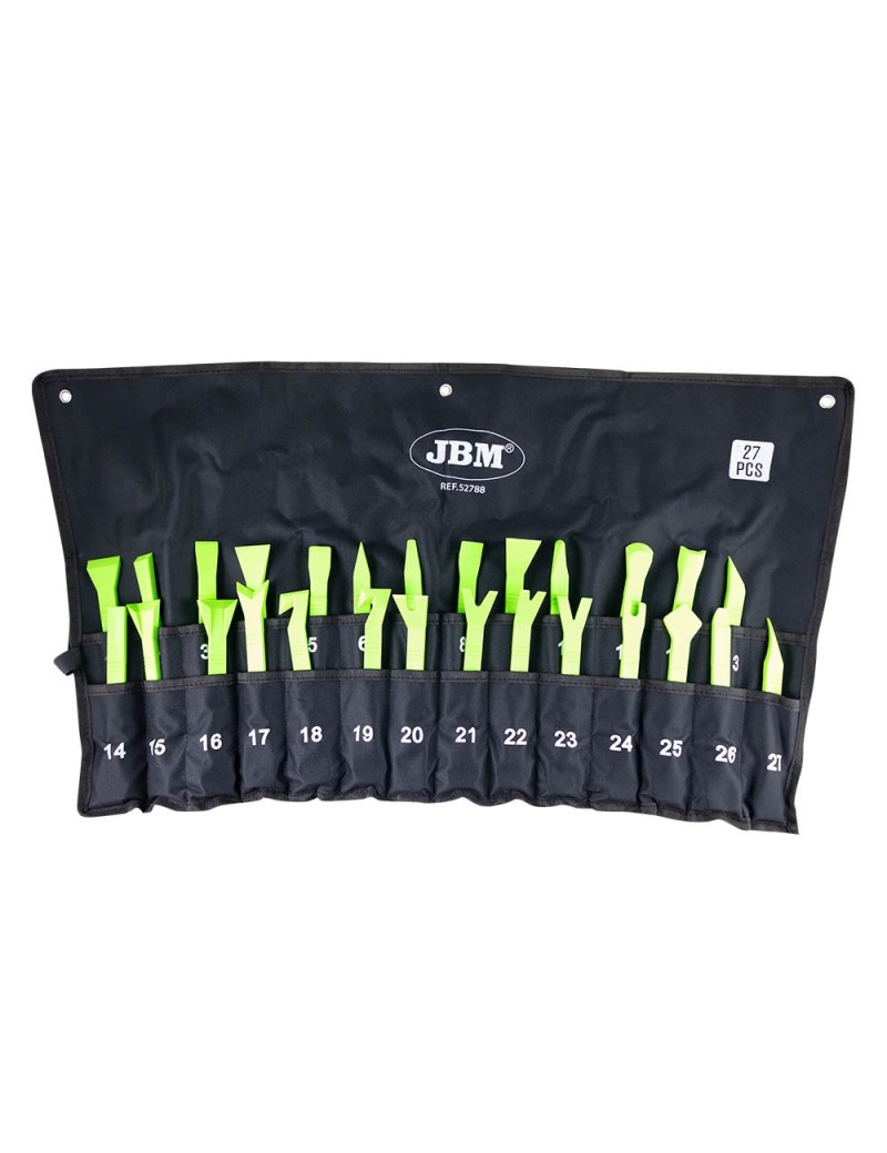Set de 27 palancas con diferentes curvaturas y terminaciones que facilitan el trabajo tanto en interiores como en exteriores de los vehículos. Su amplia variedad permite usar la herramienta adecuada en cada trabajo y pieza, facilitando el trabajo en lugares de dificil acceso.