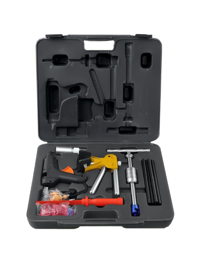 INCLUYE 1 pistola de pegamento (220-240V ~, 50Hz, 40W) 1 martillo deslizante para la Extraccion de abolladuras profundas. 1 levantador de abolladuras para la Extraccion de abolladuras ligeras en superficies planas. 1 limpiador de pegamento. 1 rascador para la Extraccion suave de las lengüetas para pegamento 8 barras de pegamento negro (11 x 200mm) 19 lengüetas para pegamento en varios tamaños y formas.
