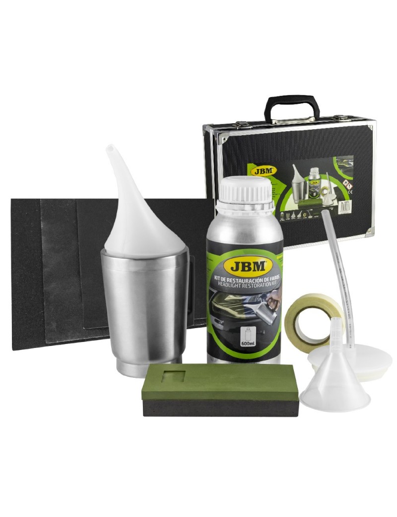 Los faros, deteriorados por el tiempo, se vuelven borrosos o incluso amarillentos provocando una reducción de la cantidad de luz que emiten y un aumento de riesgo en la conducción. El kit de restauración de faros JBM con polímero líquido es un sistema innovador que permite restaurar los faros quemados por el sol, reponiendo el estado de nuevo, con el brillo original y un acabado perfecto de una manera muy rápida y económica. Lijado manual o con máquina y posterior aclarado químico con conexión a toma de mechero o a toma de corriente. Aumenta la seguridad especialmente en la conducción nocturna. Incluye: Líquido especial de lijado (600ml) (ref. 14572) 6 papeles de lija (ref. 14564) Cinta de pintor (ref. 14573) Placa de lijar (ref. 14571) Embudo de Plastico (ref. 14570) Tapón especial para la salida de gas Tapón y tubo de Plastico para salida de gas (ref. 14569) Taza vaporizadora (ref. 14568) Enchufe toma de corriente (ref. 14565) Enchufe toma de mechero (ref. 14566) JBM LE RECUERDA QUE EL PRODUCTO NO DEBE SER CONECTADO A LA CORRIENTE DURANTE MÃS DE 5 MINUTOS YA QUE UN POSIBLE SOBRECALENTAMIENTO PUEDE DAÃAR LA TAZA DE VAPORIZACIÃN