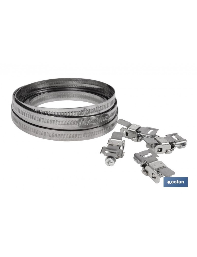 Abrazadera de fleje metálico con anchura de 9 mm y una longitud de 3 metros. Es ideal para cortar abrazaderas a medida. Esta cinta incluye un surtido de 4 cierres.