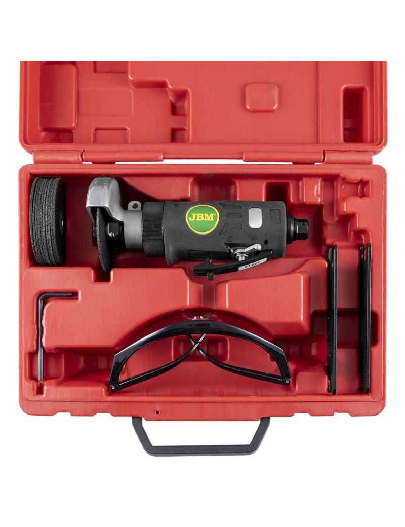 Motor compuesto. Disponible en 3/8" Entrada 1/4" 18.000 rpm Acabado en Goma Mayor agarre. Palanca Reversible (elimina chispas y desechos) Salida trasera Conectable a manguera. Rotación de entrada de aire. Ligero Diseño MINI Incluye Gafas, Palancas, allen y 10 discos de 3" Nivel ruido reducido: 81dB (A) la alimentación es neumática, trabaja con manguera de aire