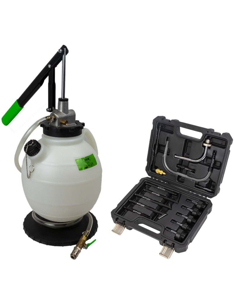 Capacidad: 7,5L Descarga: 80cc ciclo rango de viscosidad hasta SAE140 Incluye accesorios: 15 Adaptadores para FORD 1/8 - 27, universal BMW / Honda / Nissan... VW/ Audi, Skoda, Porsche, mini cooper, Mercedes, Hyundai... universal flexible 300mm, ATF-adaptador