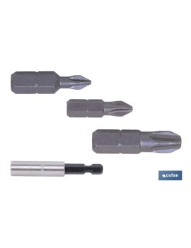 Blíster de tres puntas phillips de atornillar PH-1, 2 y 3 en 25mm de longitud, más adaptador de puntas para taladro.