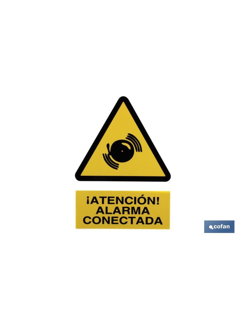 Señales de ALARMA CONECTADA en poliestireno (plástico) de 1,5mm y Adhesivas disponibles las dos gamas en varios tamaños.