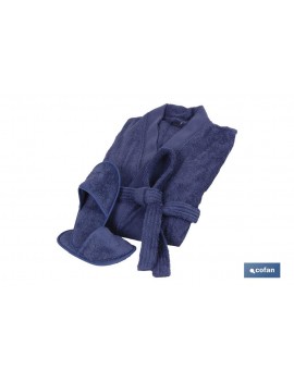 Albornoz de baño de manga larga, con cinturón para su cierre, disponible en color azul marino. Compuesto por algodón 100 % y rizo con gran capacidad de absorción. Su gramaje es de 500 g/m2. Disponible tallas: S, M, L, XL, XXL.