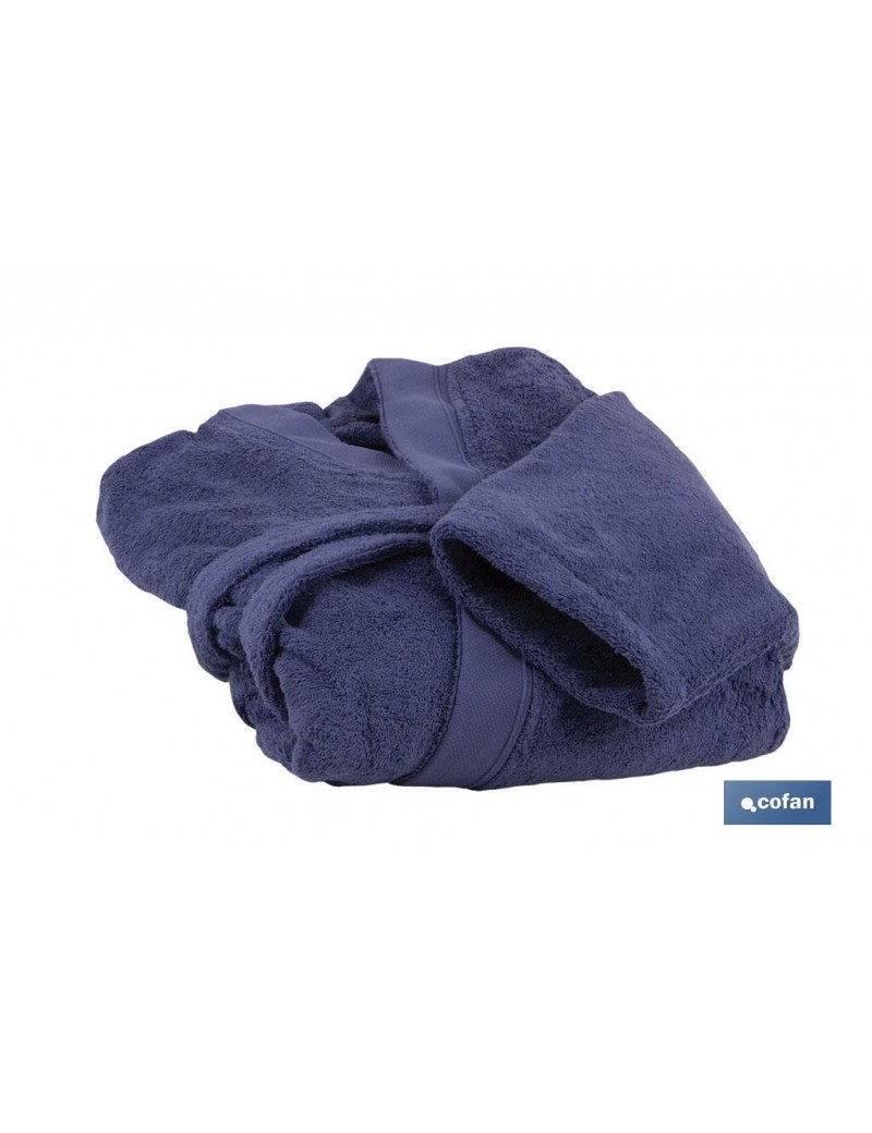Albornoz de baño de manga larga, con cinturón para su cierre, disponible en color azul marino. Compuesto por algodón 100 % y rizo con gran capacidad de absorción. Su gramaje es de 500 g/m2. Disponible tallas: S, M, L, XL, XXL.