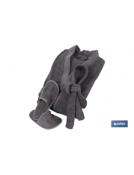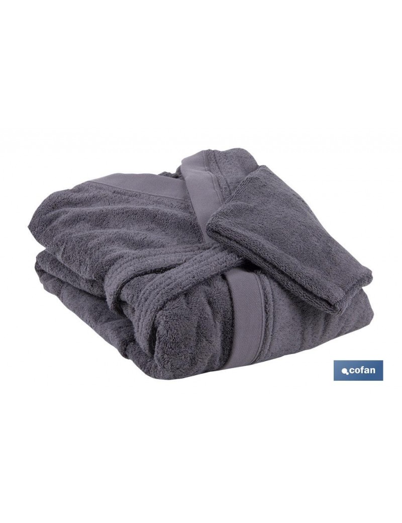 Albornoz de baño de manga larga y cinturón para cierre. Disponible en color Gris Antracita. Está compuesto por algodón 100 %, rizo con gran capacidad de absorción y gramaje de 500 g/m2. Tallas disponibles: S, M, L, XL, XXL.