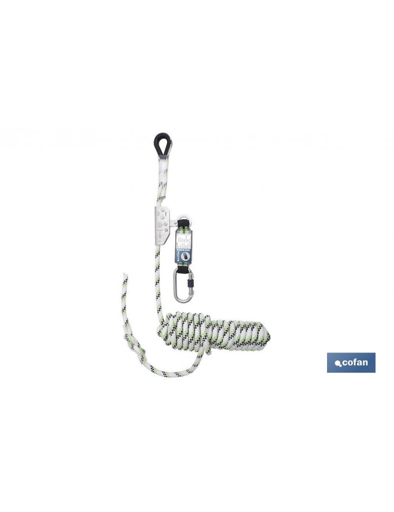 Anticaída Deslizante Cuerda Trenzada de 10 m. Sistema de apertura/cierre simple y bloqueo automático doble, con dispositivo anti inversión. Costura protegida con funda transparente que permite el control visual.