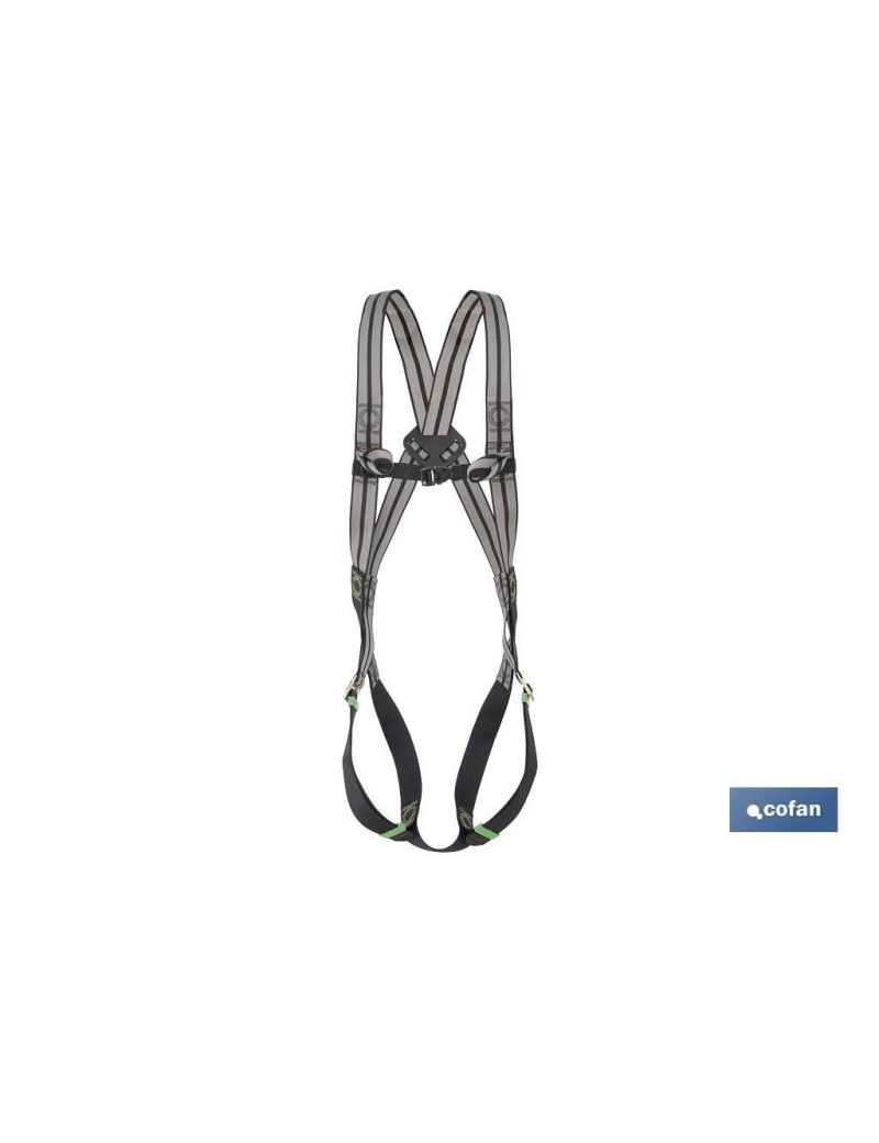Arnés anticaídas 2 puntos de enganche esternal y dorsal. Muslos ajustables y correa de asiento idónea para una mayor comodidad y ergonomía. Hombros y muslos diferenciados en 2 colores. 0,79 kg peso total