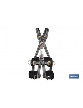 Arnés anticaídas para trabajo en suspensión. Muslos y cinturón ajustables con correa de asiento para una mayor comodidad. Las cintas de los hombros, muslos y cinturón están equipadas con hebillas de ajuste.