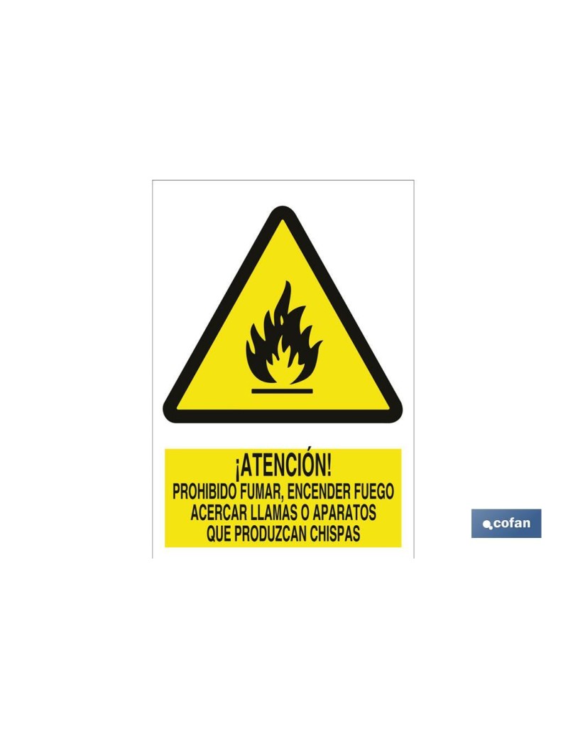 Señales de ATENCION, PROHIBIDO FUMAR, ENCENDER FUEGO, ACERCAR LLAMAS O APARATOS QUE PRODUZCAN CHISPAS en poliestireno (plástico) de 1,5mm y Adhesivas disponibles las dos gamas en varios tamaños.
