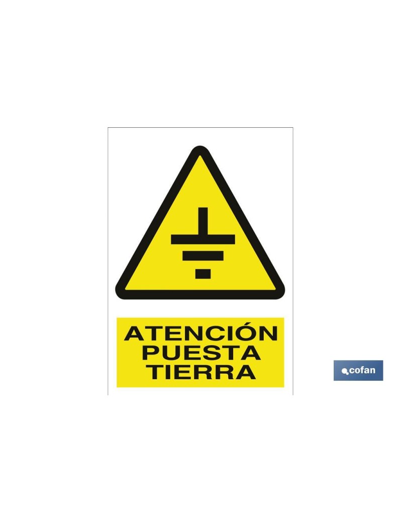 Señales de PELIGRO PUESTA A TIERRA en poliestireno (plástico) de 1,5mm y Adhesivas disponibles las dos gamas en varios tamaños.