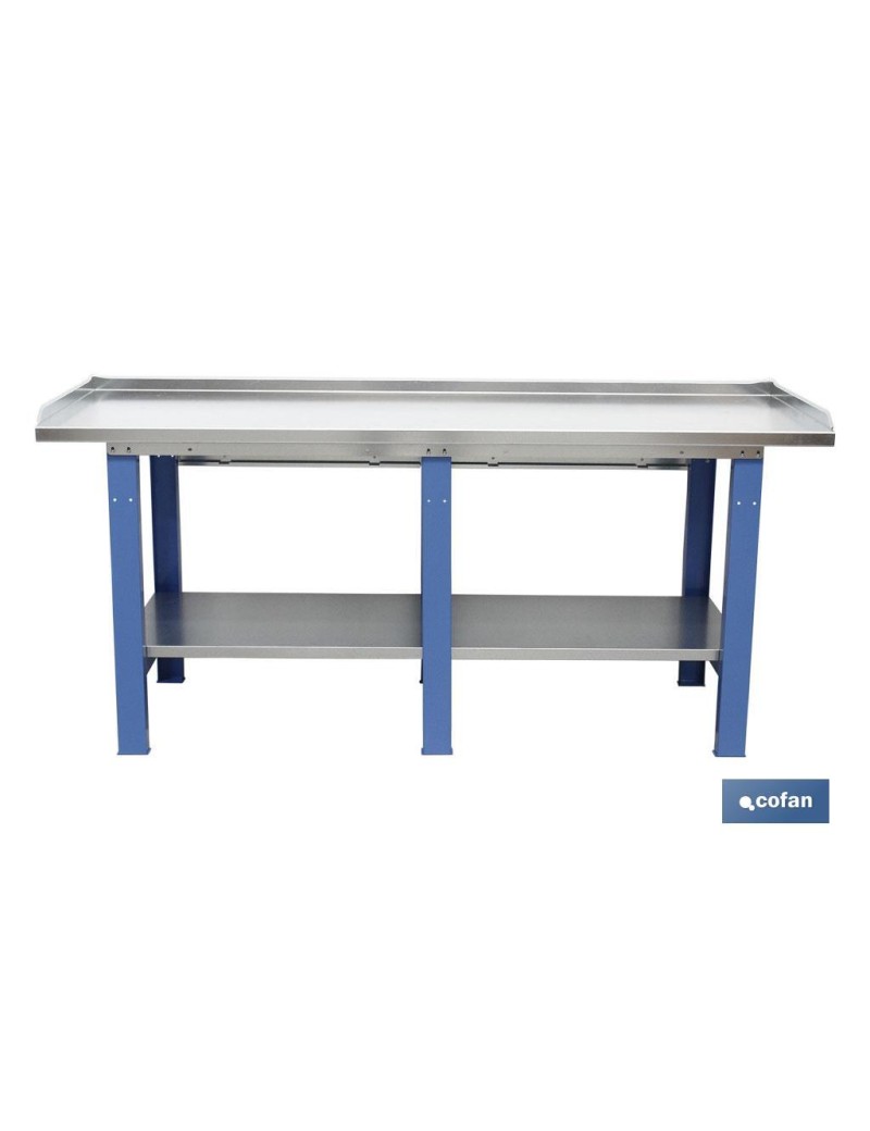 Banco Trabajo con tablero de acero galvanizado y borde anticaida con doble apoyo en el suelo. Con medida en 2 metros.