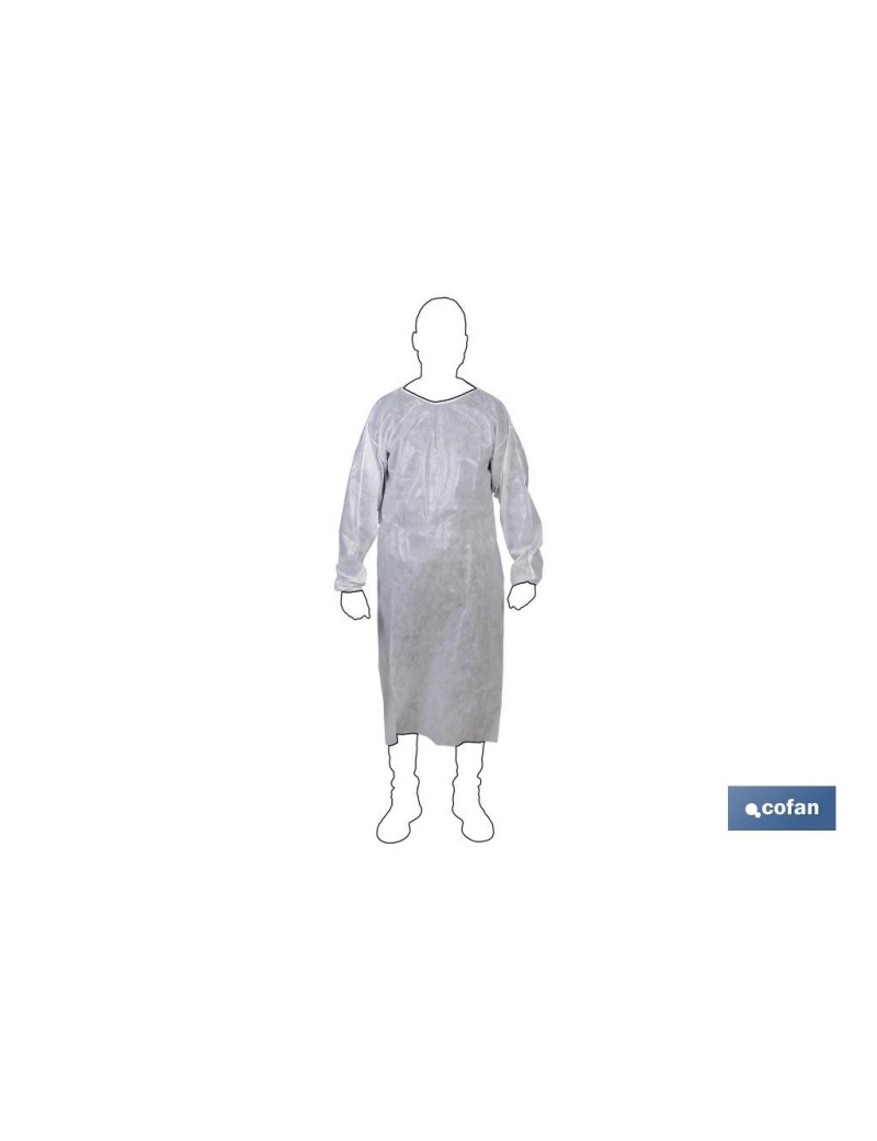 Bata de protección de un solo uso, no transpirable e impermeable, con cintas elásticas en el cuello, cintura y mangas. Confeccionada en tejido no tejido blanco laminado exterior. Destinada a la protección contra agentes biológicos tipo PBG-B, siendo resistente a la penetración de líquidos contaminados bajo presión hidrostática (Clase 5) y resistente a la penetración de agentes biológicos por contacto mecánico con sustancias que contienen líquidos contaminantes (Clase 1).