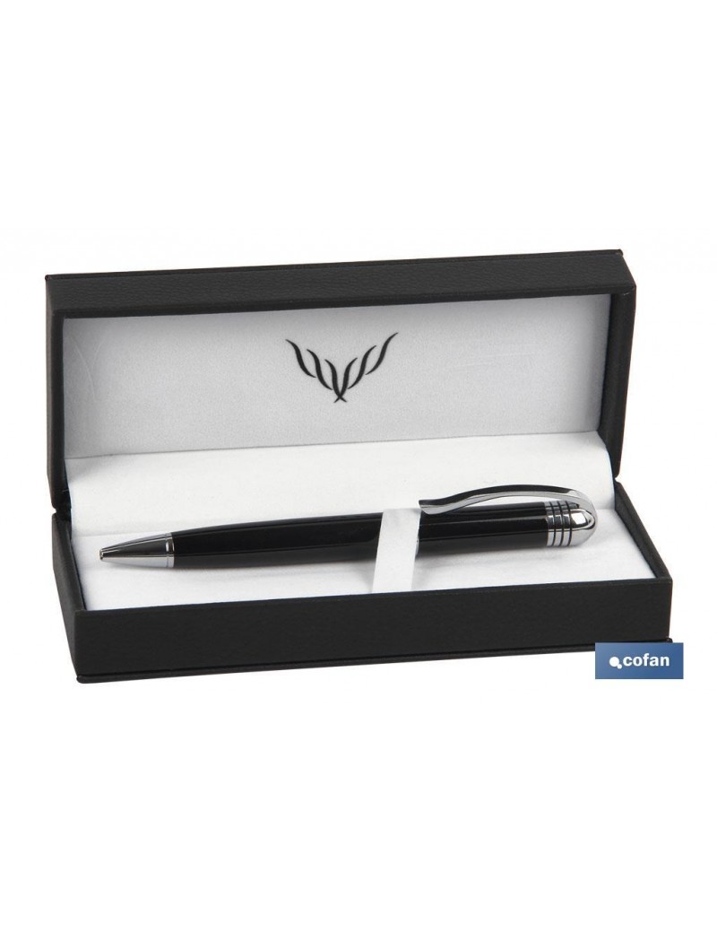 Bolígrafo Mod.Trafalgar diseño de alta calidad en acero inoxidable que proporciona un contacto ligero al escribir. Punta rodante mediana de tinta azul. Presentado en un estuche estampado de piel negra.