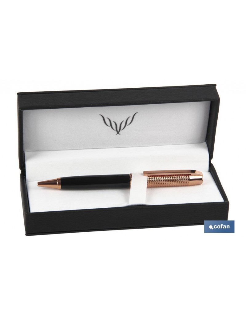 Bolígrafo Mod.Waterloo diseño de alta calidad en acero inoxidable que proporciona un contacto ligero al escribir. Punta rodante mediana de tinta azul. Presentado en un estuche estampado de piel negra.