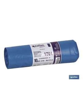 Bolsas de basura disponibles en color negro, azul y amarillo para contenedores de 120 litros. Fabricadas en polietileno de baja densidad, antidesgarro, antigota y termosellado antigoteo. Son muy resistentes, con un grosor de 150, para los usos más exigentes. Se suministran en rollos de 10 bolsas para más comodidad. Ideal para reciclaje de residuos y para grandes cantidades de basura. Medidas de la bolsa: 90 x 110 cm.