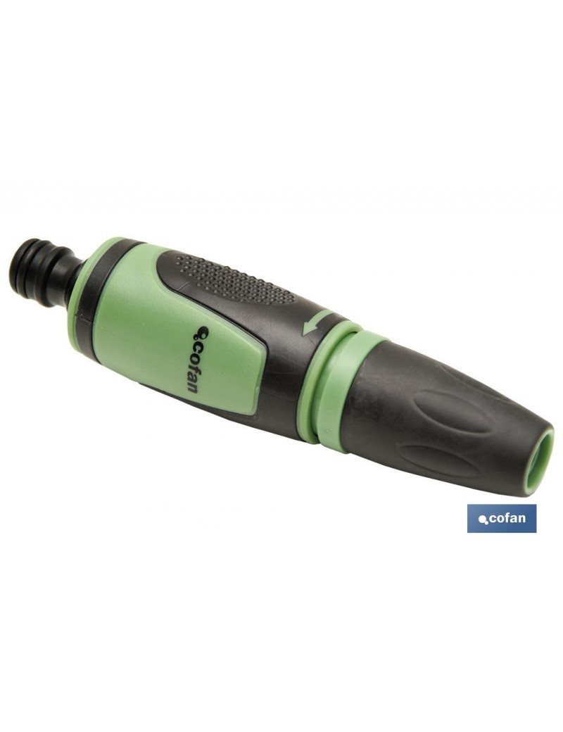 Boquilla regulable confort para mangueras de jardín. El pulverizador de la boquilla se ajusta a dos funciones la de pulverizador o chorro de gran caudal. Esta boquilla es recomendable para utilizar en grandes distancias y para usar bombas potentes. El conector de la boquilla es universal para poder utilizarla con cualquier manguera existente en el mercado. Gracias a su recubrimiento y su composición, está expuesta contra los rayos solares. Es muy fácil de instalar ya que solo hay que enroscar, conectar y listo para ser usada. La boquilla es de muy buena calidad, y está fabricada en plástico ABS. Su extremo y empuñadura son de goma suave.