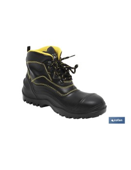Bota de agua baja con cordones. Disponible en color negro con dobles costuras en amarillo. Es una bota de seguridad S5, con puntera y plantilla de acero. Es impermeable y con la suela antideslizante. Articulo conocido como vestuario laboral, bota trabajo, calzado seguridad.
