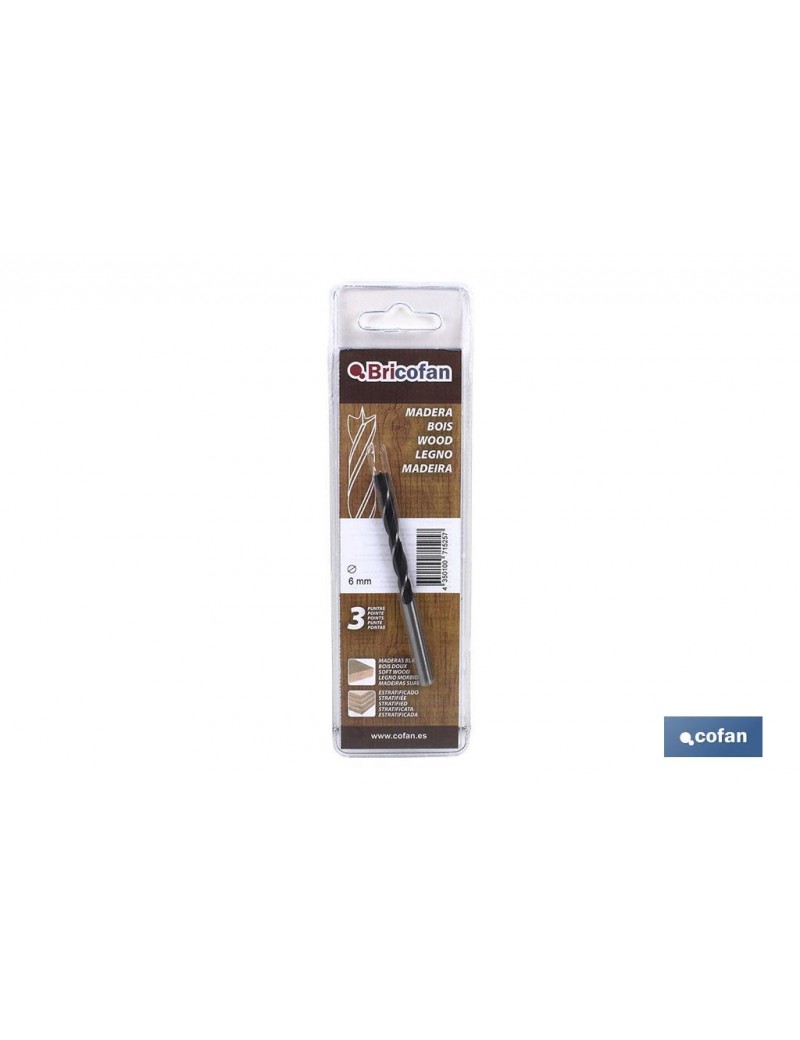 Brocas Bricofan MADERA (Tres Puntas) para maderas duras y medias, envasadas en Blíster termoconformado en envase indivudual.