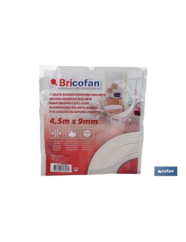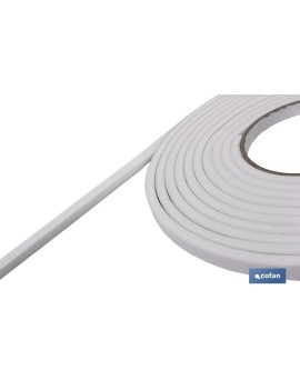 Rollo de Burlete Adhesivo de Espuma color Blanco. Medidas: 4,5 m longitud x 9 mm de grosor. Es flexible, duradero, limpio y fácil de colocar. Para aplicar como aislamiento térmico y de ruido en ventanas y puertas de todo tipo. Fácil de cortar para ajustar en cualquier marco. Disponible pack con 6 unidades o 1 unidad.