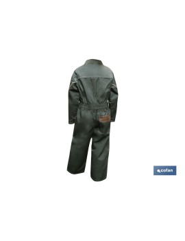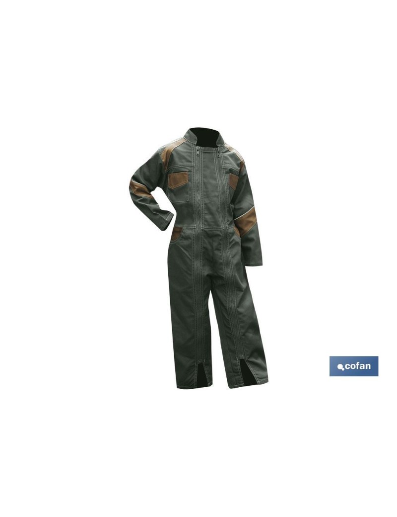 Buzo en color kaki/havane modelo tournevis para niños. Con dos cremalleras que van desde el cuello hasta los tobillos para poder ponertelo y quitártelo con más facilidad. Está compuesto por un 65 % de algodón y un 35 % de poliéster con un grameje de 245 g/m2. Las tallas disponibles van desde 2 años hasta los 14. Cuenta con bolsillos para poder guardar todo tipo de objetos.