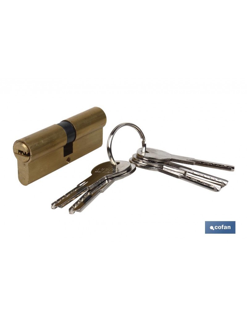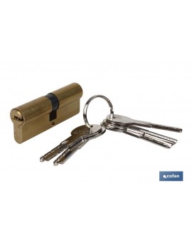 Cilindro seguridad Doble embrague leva larga latón. Se suministra 5 llaves. Permiten tener insertada una llave por cada lado y que ambas funcionen perfectamente. Color Latón