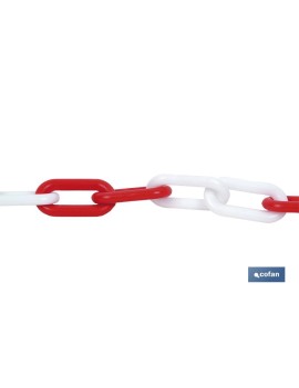 Cadena de plástico en color rojo y blanco, com medida en diámetro de 8mm. Disponible en rollos de 25 metros de longitud.