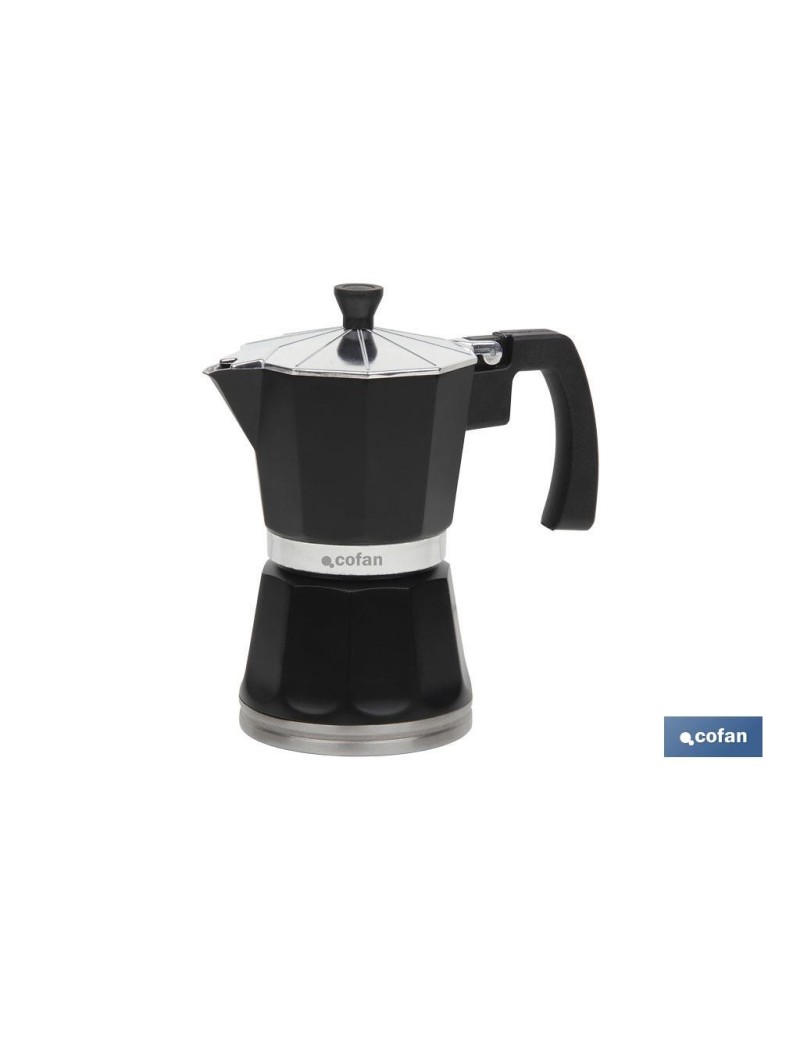 Cafetera negra de aluminio para inducción. Modelo Baviera. Cafetera de aluminio con revestimiento en color negro. Con mango en forma de T. Mango y tirador en color negro, también son resistentes al fuego. La base es de acero inoxidable 430. Apta para todo tipo de fuegos, incluido inducción. Con capacidad para 6 tazas.
