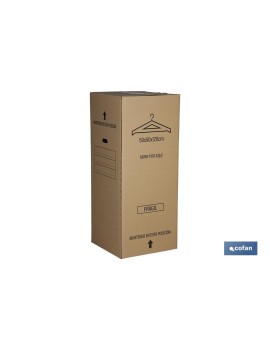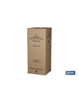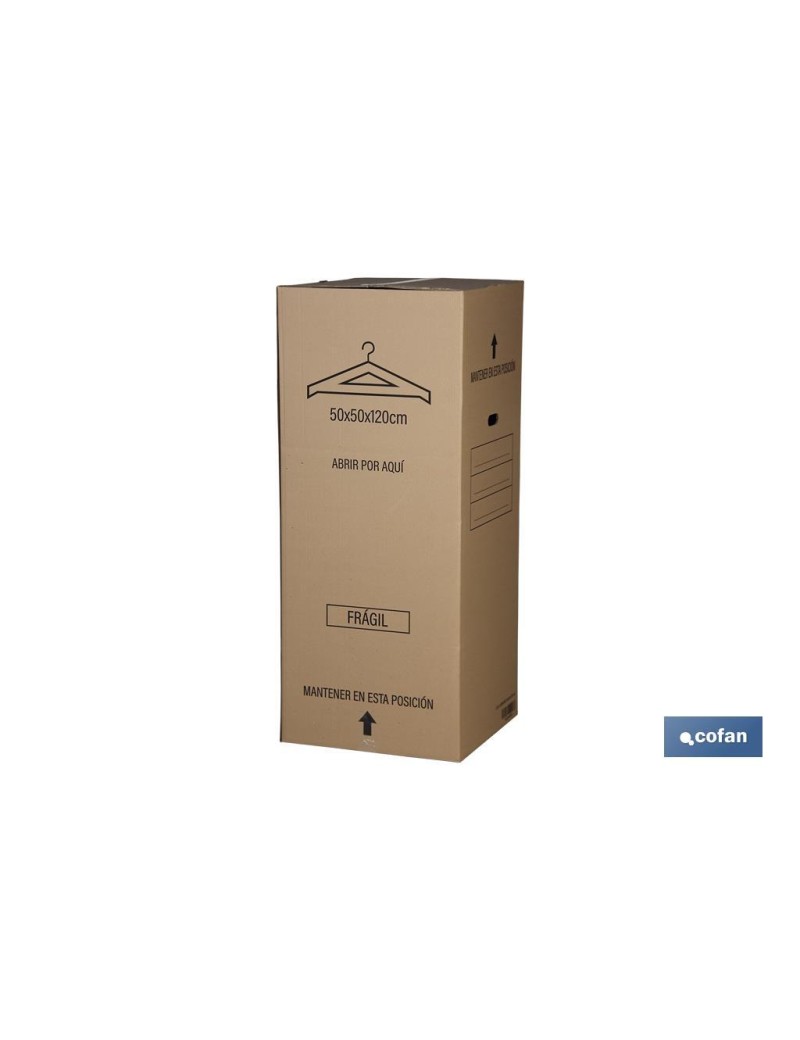 Caja armario de cartón para mudanzas con medida 50 x 50 x 120 cm. Esta caja es una excelente solución de embalaje, ya que está diseñada para el transporte y almacenamiento de prendas colgadas, con el fin de evitar que éstas se arruguen. Estas cajas armario se componen por una pieza de cartón ondulado de alta resistencia. Barra no incluída.