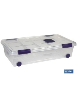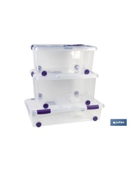 Cajas de ordenación fabricadas en polipropileno transparente para ver su contenido y acceder de forma más rápida. Sus tapas cuentan con cierre a presión, ayudando al cuidado y la conservación de las prendas o accesorios que se guarden, sea ropa, juguetes, accesorios, etc.Las cajas de ordenación cuentan con ruedas para facilitar el desplazamiento. Son muy cómodos y apilables, perfectos para ocupar el mínimo espacio. En la tapa tiene un polillero, para incorporar un producto antipolillas, que ayuda a conservar su ropa o cualquier accesorio.