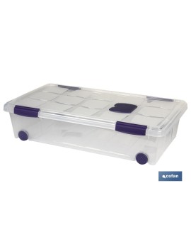 Cajas de ordenación fabricadas en polipropileno transparente para ver su contenido y acceder de forma más rápida. Sus tapas cuentan con cierre a presión, ayudando al cuidado y la conservación de las prendas o accesorios que se guarden, sea ropa, juguetes, accesorios, etc.Las cajas de ordenación cuentan con ruedas para facilitar el desplazamiento. Son muy cómodos y apilables, perfectos para ocupar el mínimo espacio. En la tapa tiene un polillero, para incorporar un producto antipolillas, que ayuda a conservar su ropa o cualquier accesorio.