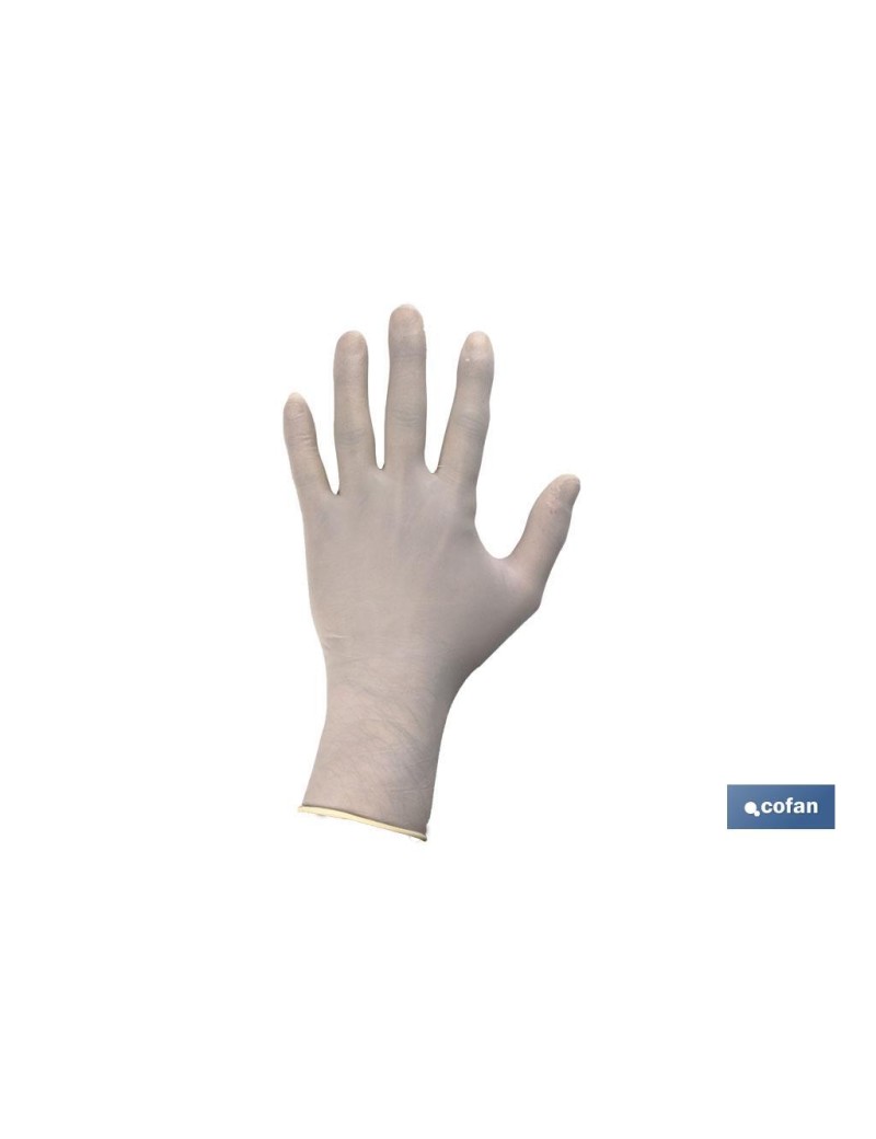Caja dispensadora de 100 guantes finos ambidiestros 100% látex con polvillo. Compatibles con uso alimentario. Longitud 24 cm. AQL 1,5.