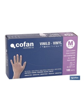 Caja dispensadora de 100 guantes finos 100% vinilo con polvillo y ambidiestros. Compatible con uso alimentario. Longitud 24 cm. AQL 1,5.