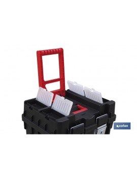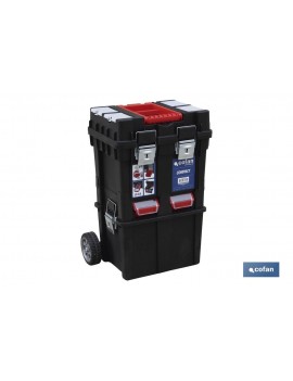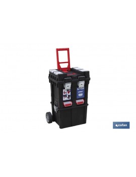 Caja de Herramientas Modelo Compact con ruedas, con doble cuerpo desmontable provista de 6 cajones para pequeño material, asa extensible para transporte y ruedas desmontables.