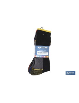 Calcetines con refuerzo de poliamida con caña de doble punto elásticos para un mayor confort. Disponible en las tallas 39/42, 43/45 y 46/48. Elaborados con 65 % Algodón - 25 % Poliéster - 7 % Poliamida - 3 % Elastano. Color negro con detalles en rojo, amarillo y azul.