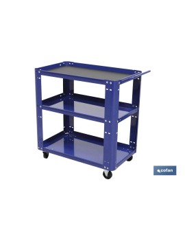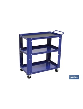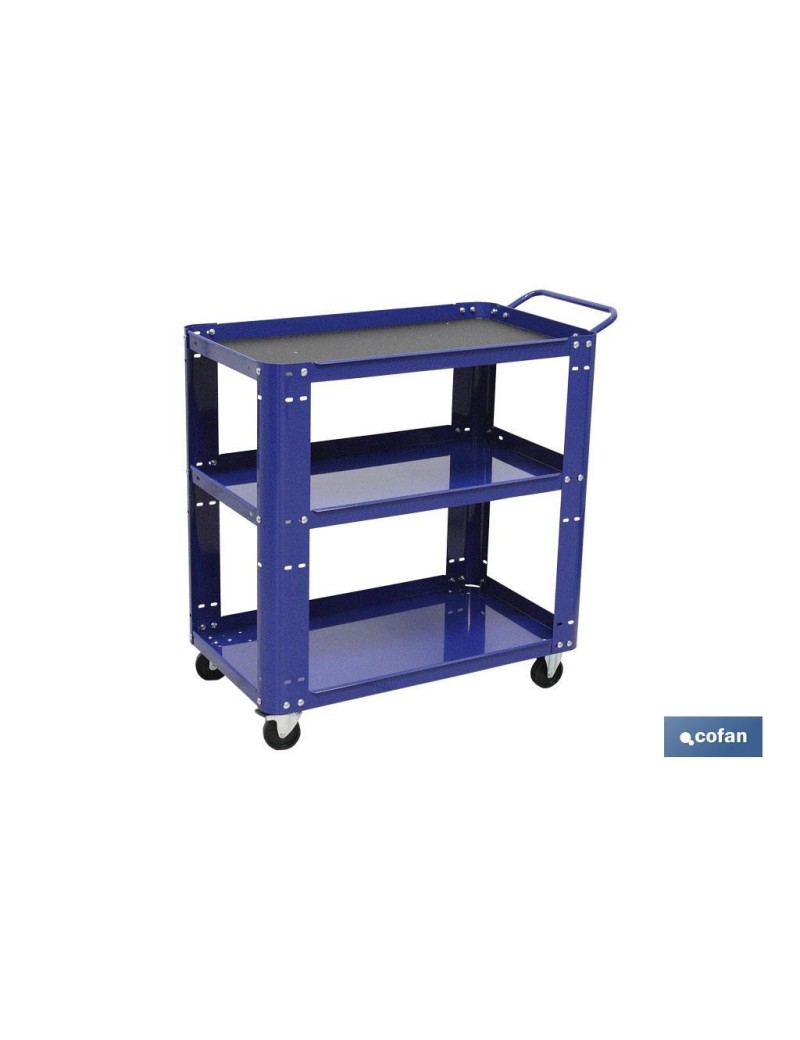 Carro azul de herramientas con tres estantes modelo chapista desmontable, se envía al consumidor desmontado en una caja de tamaño reducido.
