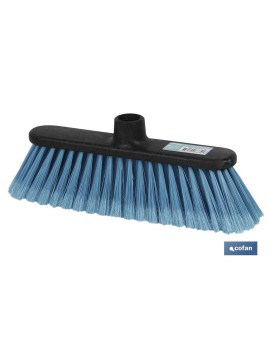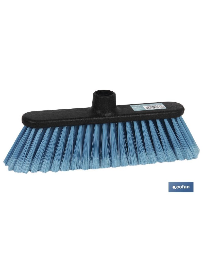 Cepillo de barrer basic con taco de color negro. Modelo Akil. Está fabricado con fibras de PVC suaves de alta calidad, de color azul. Válido para barrer interiores y exteriores. Las medidas son: 29 x 9 x 11 cm. Tiene una gran funcionalidad, resistencia y buena presencia, todo en el mismo producto. Cepillo de barrer multiusos, para utilizar en cualquier zona de la casa.