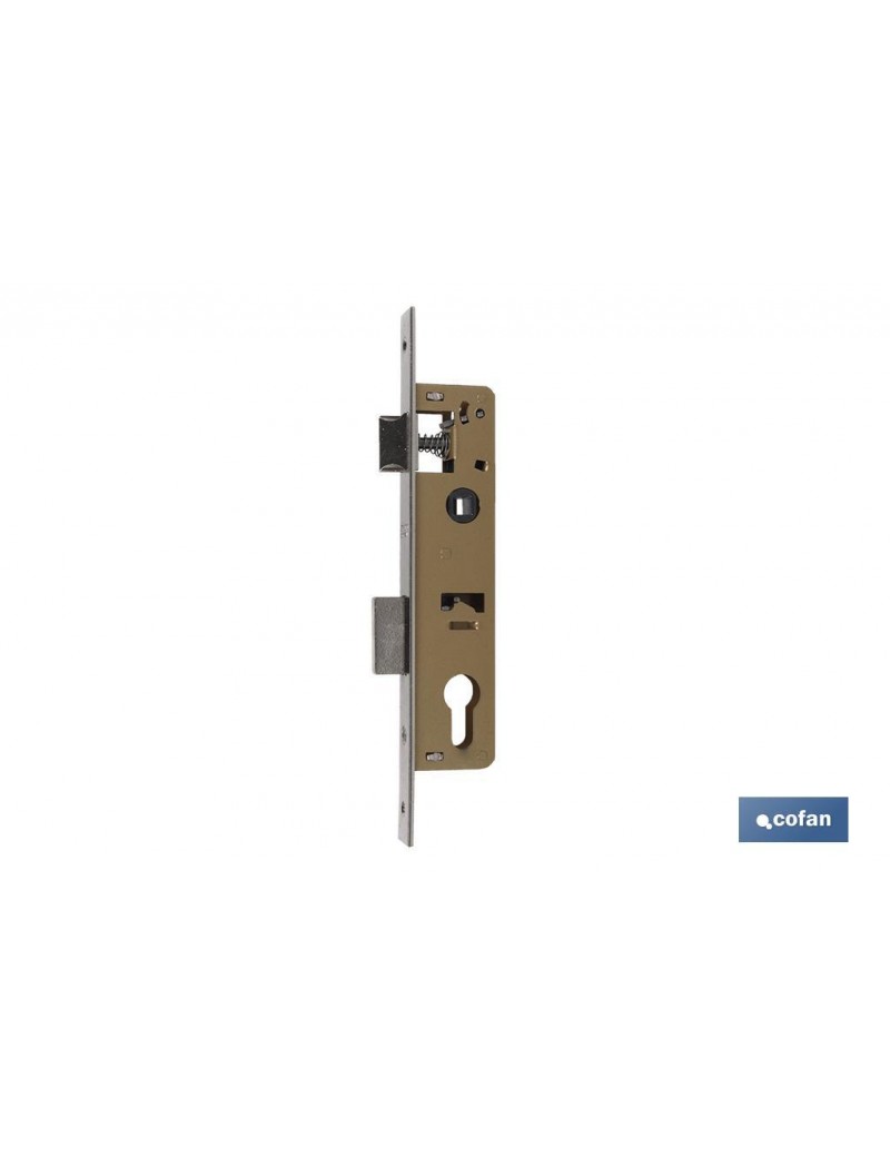 Cerradura embutir para puertas metálicas, Cuerpo pintado. Frente en acero niquelado. Palanca deslizante niquelada. Picaporte reversible niquelado. Contiene Tornillos y cerradero.