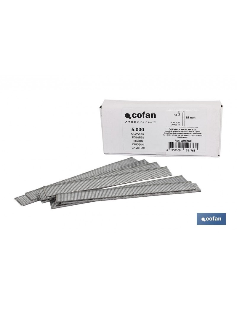 Clavos modelo TG/15, 20, 25, 30, 40 y 50 mm de longitud y medida de 1x1,25mm para Clavadoras modelos TG, en cajas de 5.000 pcs.